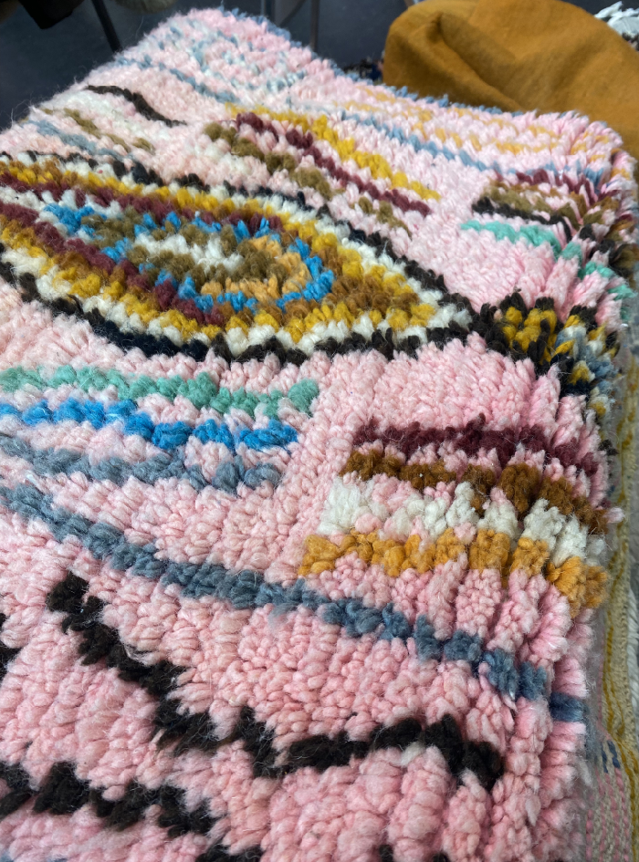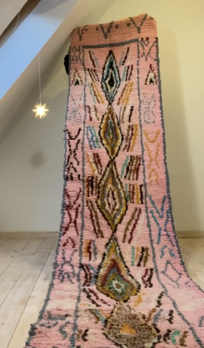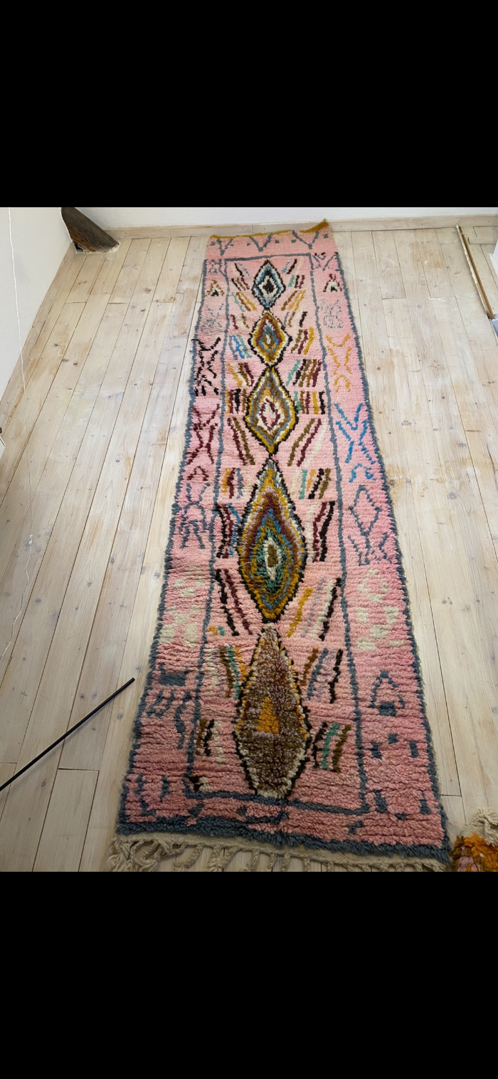 Exceptionally pretty runner rug Lalla fresh off the loom. It was handwoven in the Atlas Mountains by one of our partner weaveries. The design is a beautiful light pink base and some additional colorful symbols. It’s a one of a kind piece you won’t find again. Decorate your floor in a unique way with this joyful long runner rug.
